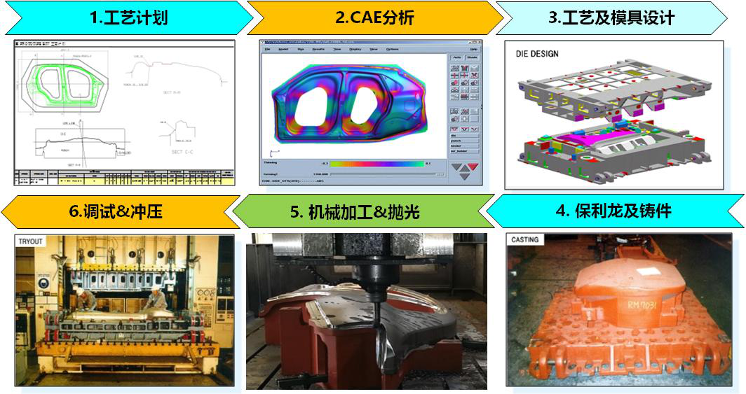 (1)工藝及CAE分析 模具設計 鑄造 模具加工 (2)調(diào)試及沖壓 激光切割 (3)質(zhì)檢/出庫